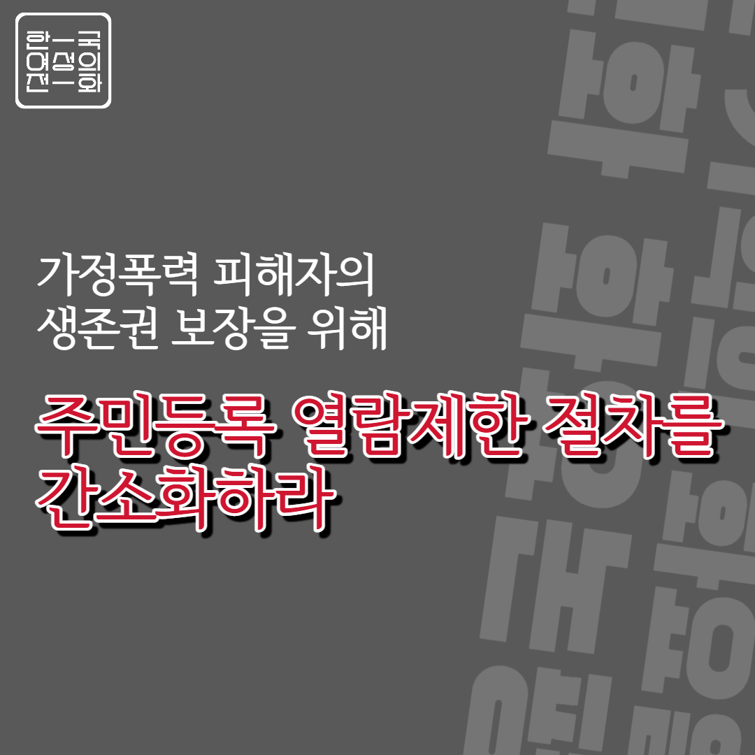 행정안전부는 의원 발의된 주민등록법 개정안과 함께 3월 중에 하위법령을 동시에 개정할 계획이라고 한다. 이에 우리는 가정폭력 피해자의 안전과 생명권 보장을 위해 이번 개선 방안에 열람제한 신청을 간소화하는 내용을 추가로 포함하여 수정 보완할 것을 강력히 요구한다.