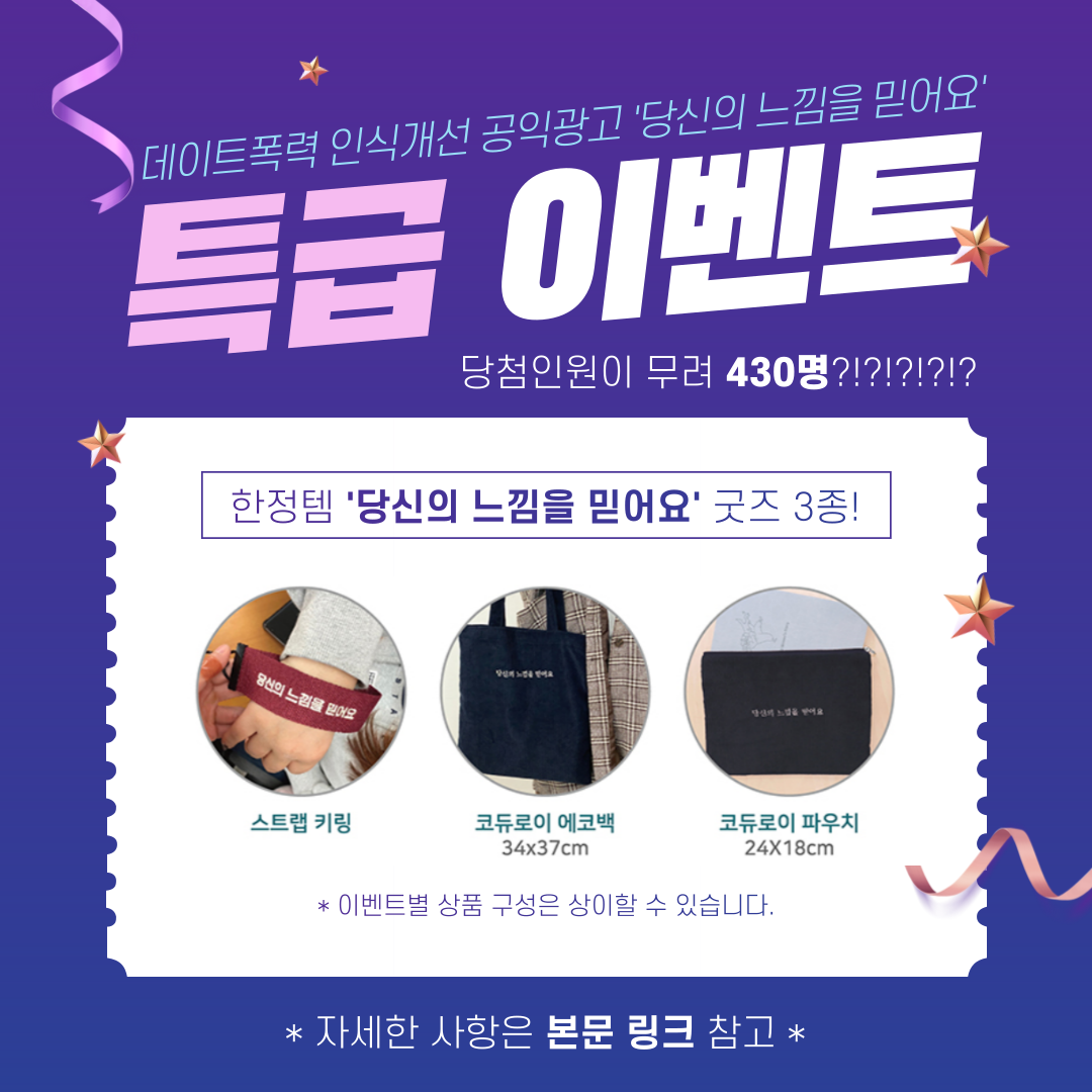 : 홍대입구역/삼성역/강남역에 설치되어 있는 한국여성의전화 데이트폭력 인식개선 공익광고 '당신의 느낌을 믿어요' 광고 스팟을 찾아 인증샷을 찍은 후, 인스타그램/트위터에 #당신의느낌을믿어요_인증샷 #한국여성의전화 #데이트폭력 해시태그와 함께 인증샷을 남겨주세요!