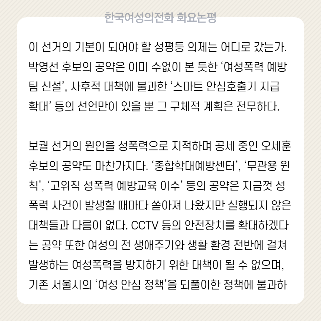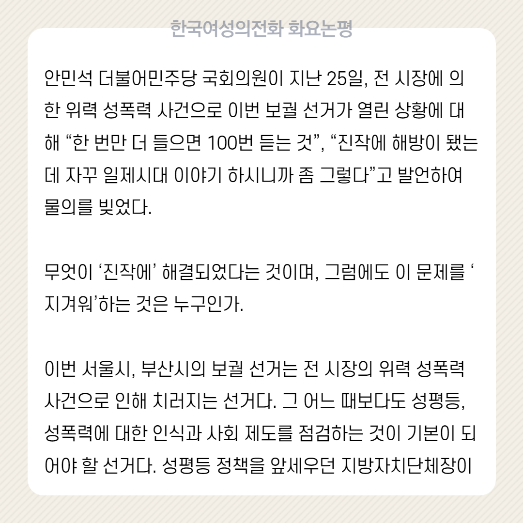 이번 서울시, 부산시의 보궐 선거는 전 시장의 위력 성폭력 사건으로 인해 치러지는 선거다. 그 어느 때보다도 성평등, 성폭력에 대한 인식과 사회 제도를 점검하는 것이 기본이 되어야 할 선거다. 성평등 정책을 앞세우던 지방자치단체장이 도리어 성폭력을 자행한 것, 이를 수 년 동안 묵인한 성차별적이고 위계적인 조직 구조와 제도를 돌아보는 것, 본 사건의 정의로운 해결과 재발 방지 대책을 마련하는 것, 결국 일상적인 성폭력을 용인하고 가능하게 하는 우리 사회의 성차별을 뿌리 뽑는 것이 논의되어야 할 선거다.
