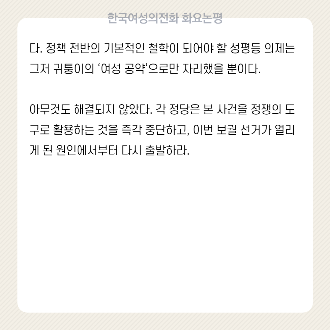 아무것도 해결되지 않았다. 각 정당은 본 사건을 정쟁의 도구로 활용하는 것을 즉각 중단하고, 이번 보궐 선거가 열리게 된 원인에서부터 다시 출발하라.