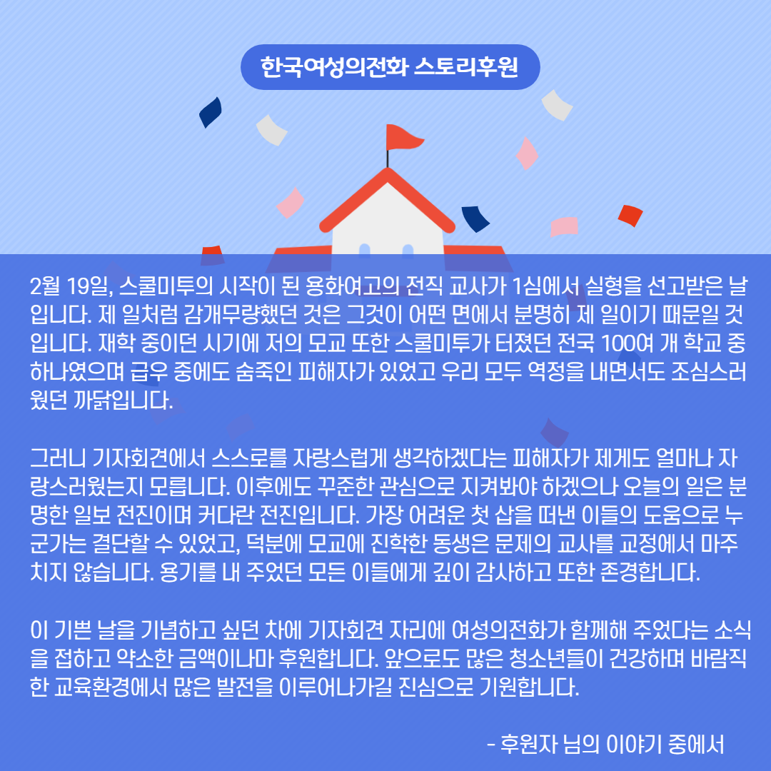 지난 19일의 선고를 기념하며, 학창시절 존경했던 여성 멘토의 이름으로 스토리후원을 해주셨는데요.