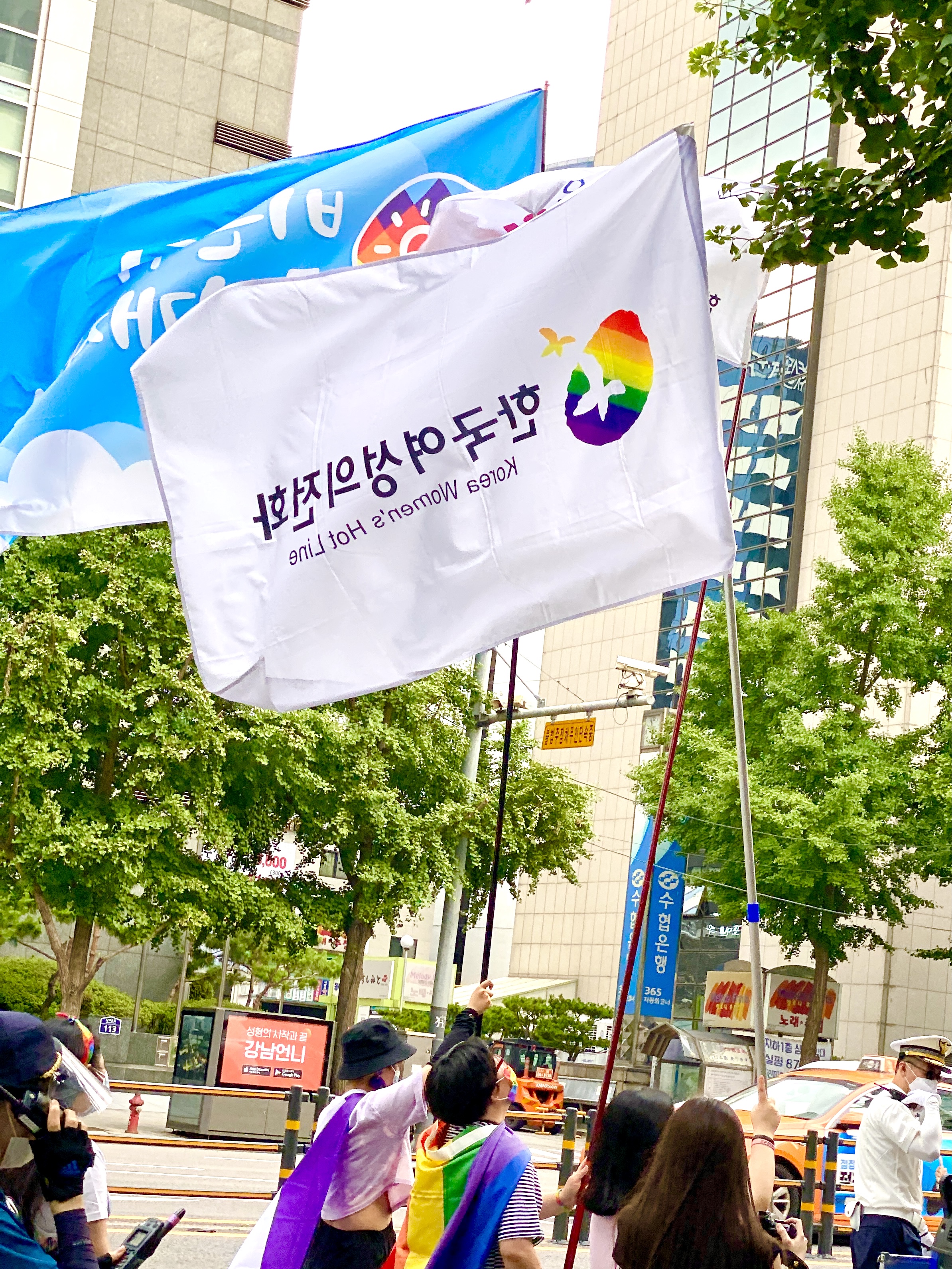 작년에는 코로나 시기로 인해 행진이 없어 아쉬웠는데, 올해에는 서울퀴어문화축제 기획단의 여러 고민 끝에 행진을 진행할 수 있게 되었습니다. 각 단체가 신청을 통해 참여했으며, 한국여성의전화도 무지개 깃발을 들고 미니 카트 뒤를 따라 열심히 행진했습니다.