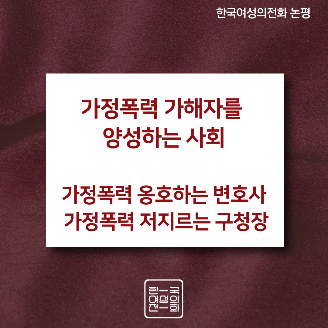 가정폭력에 대한 잘못된 인식과 편견에 사로잡힌 발언들이 반복되고, 가정폭력이 제대로 처벌되지 않는 것은 일부 경찰, 공직자 개인의 문제가 아니다. 여성폭력방지기본법에 따르면 ‘국가와 지방자치단체는 여성폭력방지 및 피해자 보호 및 지원 등을 위하여 필요한 종합적인 시책을 수립·시행 하여야 한다’고 명시하고 있다. 국가는 문제를 일으키는 개인을 징계하는 것에 그치지 말고, 가정폭력에 대한 공공기관의 전체 인식 및 체계 점검, 성 인지 감수성과 가정폭력에 대한 전문성 교육, 나아가 ‘가정유지와 회복’을 목적으로 하는 가정폭력처벌법 등 제도 개선을 위해 힘써야 할 것이다. 더 이상 가정폭력을 개인의 문제, 사소한 문제로 치부하지 말라. 가정폭력은 범죄이며, 단 한 번의 폭력도 용납해서는 안 된다. 한국여성의전화는 법무부, 법률구조공단, 더불어민주당이 이번 사건을 어떻게 대응하는지 끝까지 지켜볼 것이다.