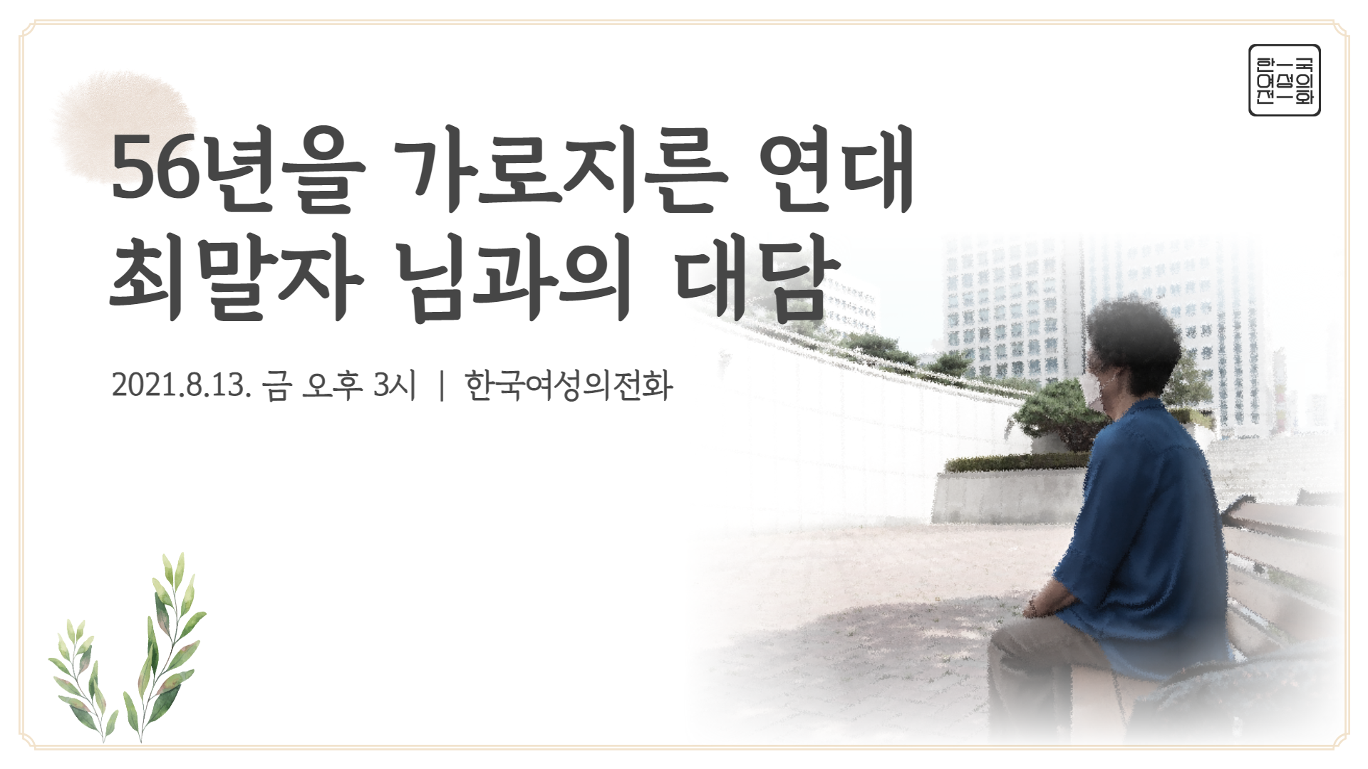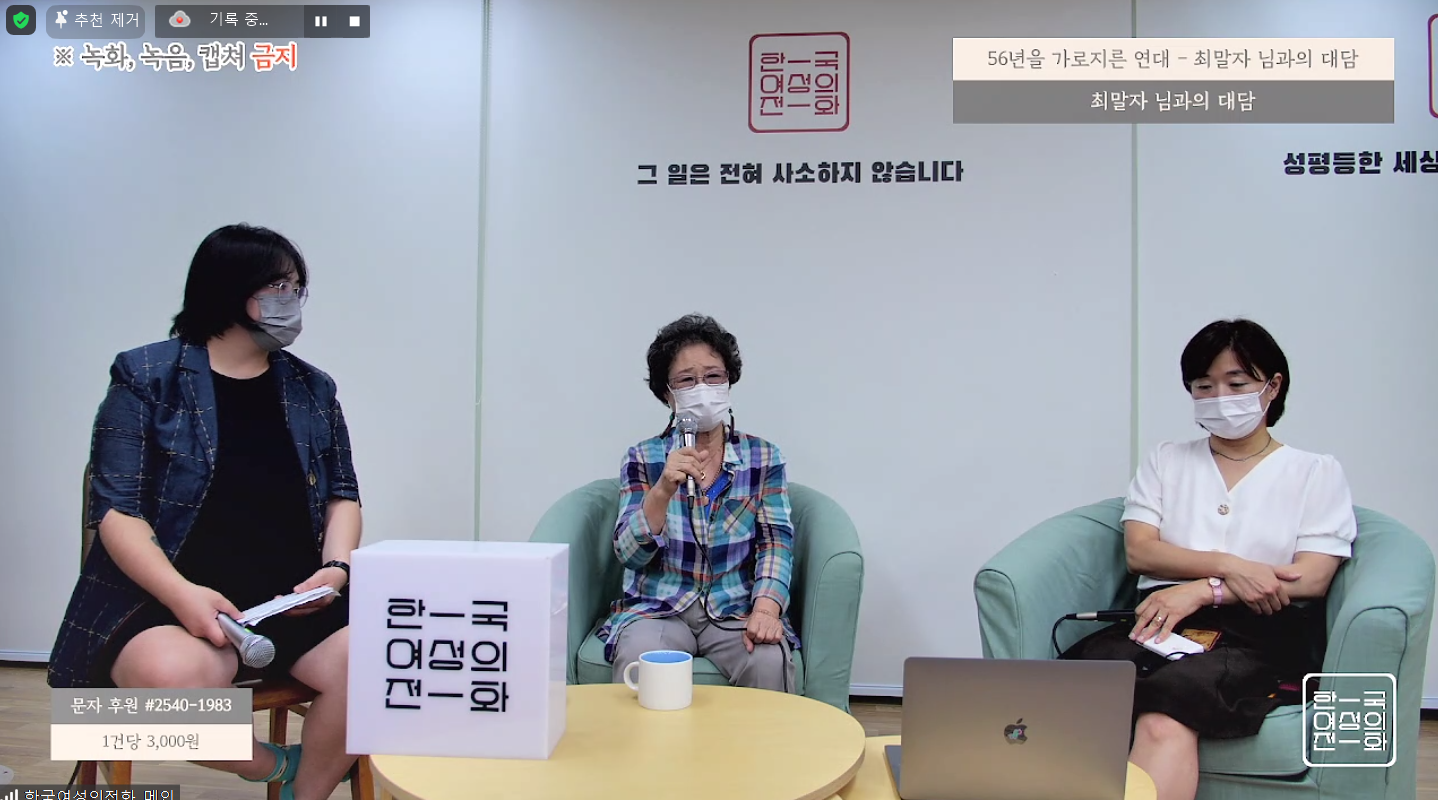 한국여성의전화는 8월 13일 ‘56년을 가로지른 연대, 최말자 님과의 대담’을 개최하였습니다. 150여 명이 참석한 이번 행사는 온라인 줌(ZOOM)을 통해 생중계되었습니다.