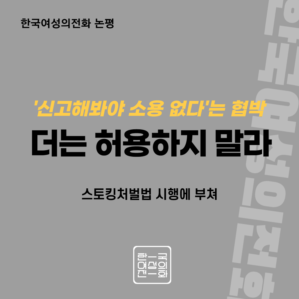 | 쉽게 읽는 화요논평: '신고해봐야 소용없다'는 협박, 더는 허용하지 말라- 스토킹처벌법 시행에 부쳐 (0) | 2021.11.09 |
