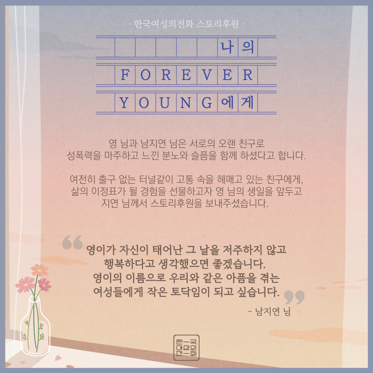 남지연 님께서 오랜 친구인 영 님의 생일을 앞두고 스토리후원을 보내주셨습니다. 영 님과 지연님께서 더 이상 아프지 않고 성평등한 일상을 보내실 수 있기를 한국여성의전화가 기원하겠습니다.