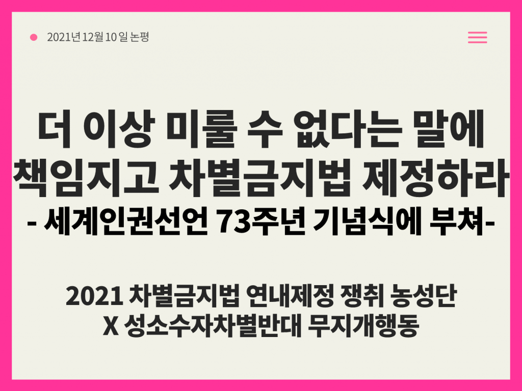 | [연대논평]더불어민주당은 혐오 동조를 멈추고 차별금지법 제정 계획을 밝혀라 (0) | 2021.12.13 |