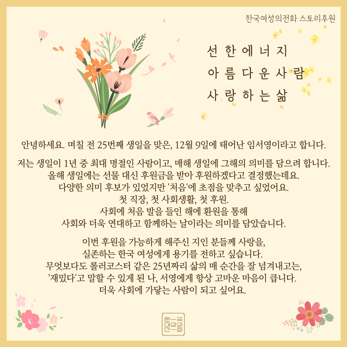 임서영 님의 25번째 생일을 맞아 서영 님과 서영 님의 지인분들이 마음을 모아 후원을 해주셨어요. 임서영 님의 의미있는 생일을 축하드리며, 좋은 사람들과 함께 따뜻하고 성평등한 연말을 보내시길 한국여성의전화가 기원하겠습니다!
