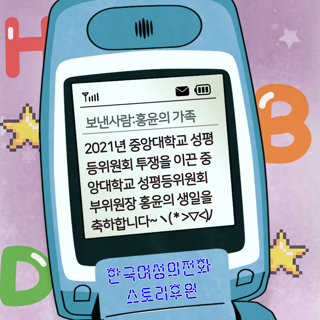 중앙대학교 성평등위원회 부위원장 홍윤 님의 생일을 축하합니다! 7명의 친구들(a.k.a. 홍윤의 가족)이 홍윤 님의 생일을 맞아 스토리 후원을 보내주셨어요. 주변 사람들과 함께 행복하고 성평등한 일상 보내시길 한국여성의전화가 응원하겠습니다 :)