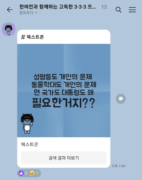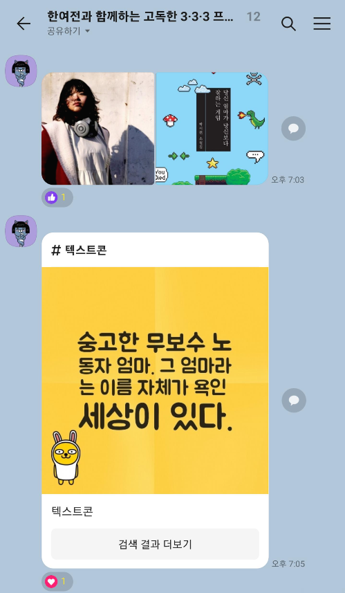 한여전에서 준비한 색다른 프로젝트! 회원 비정기 모임 ‘한여전과 함께하는 3·3·3 프로젝트’가 3주에 걸쳐 마무리되었습니다. ‘한여전과 함께하는 3·3·3 프로젝트’는 한국여성의전화와 함께 3일 동안! 단 3분! 3개의 미션을 완료해보며 새로운 목표를 완성해가는 모임이었는데요. 이번 모임은 특별하게, 자기소개를 준비하지 않아도! 사진만으로도 빠른 진행이 가능한 ‘고독한 채팅방’을 컨셉으로 진행해보았답니다.