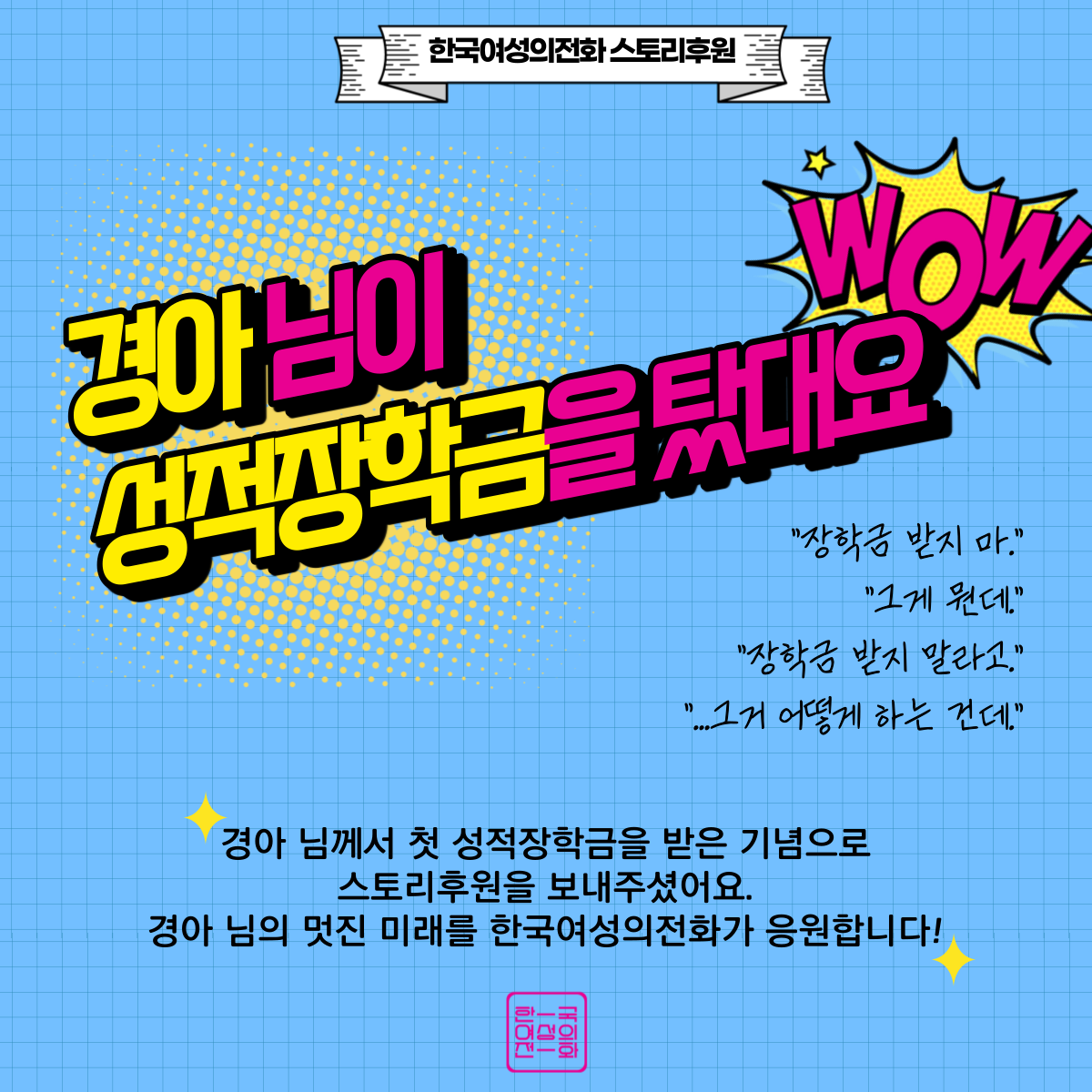 경아 님의 첫 성적장학금을 받으셨다고 합니다. 축하합니다! 경아 님의 멋진 미래, 한국여성의전화가 응원할게요 :)