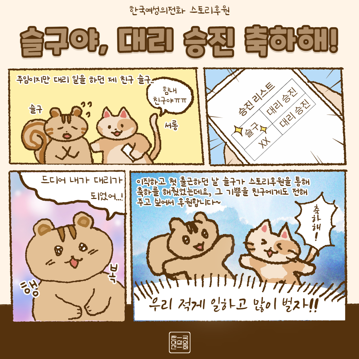 서롱 님께서 친구 슬구 님의 대리 승진을 축하하며 스토리 후원을 보내주셨어요. 슬구 님은 작년에 서롱 님의 이직을 축하하며 스토리 후원을 보내주셨는데요. 두 분의 우정과 행복한 직장 생활을 한국여성의전화가 응원합니다!