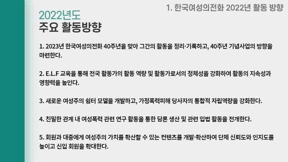 여러 주제를 활발히 논의한 덕분에 2022년 1차 회원운영위원회를 무사히 마무리할 수 있었습니다. 온라인으로 만났지만, 한국여성의전화를 향한 회원운영위원들의 열기는 사무실까지 전해졌습니다.