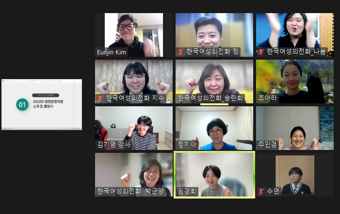 회원들과 함께하는 한국여성의전화! 한국여성의전화는 회원운영위원회와 회원 설문, 정기총회 등 회원과의 소통 구조를 통해 소통하며 성평등한 사회를 만드는 활동을 펼쳐나가고 있습니다. 코로나 n년차, 회원들과의 오프라인 만남이 줄어 아쉬운 마음이 큰데요. 그럼에도 불구하고 온라인 활동의 장인이 된 한국여성의전화 사무국과, 그리고 온라인 참여의 달인이 된 한국여성의전화 회원들이 회원운영위원회에 모였습니다. 대망의 2022년의 1차 회원운영위원회! 3월 29일 오후 7시 30분에 온라인 줌(Zoom)으로 개최되었습니다.