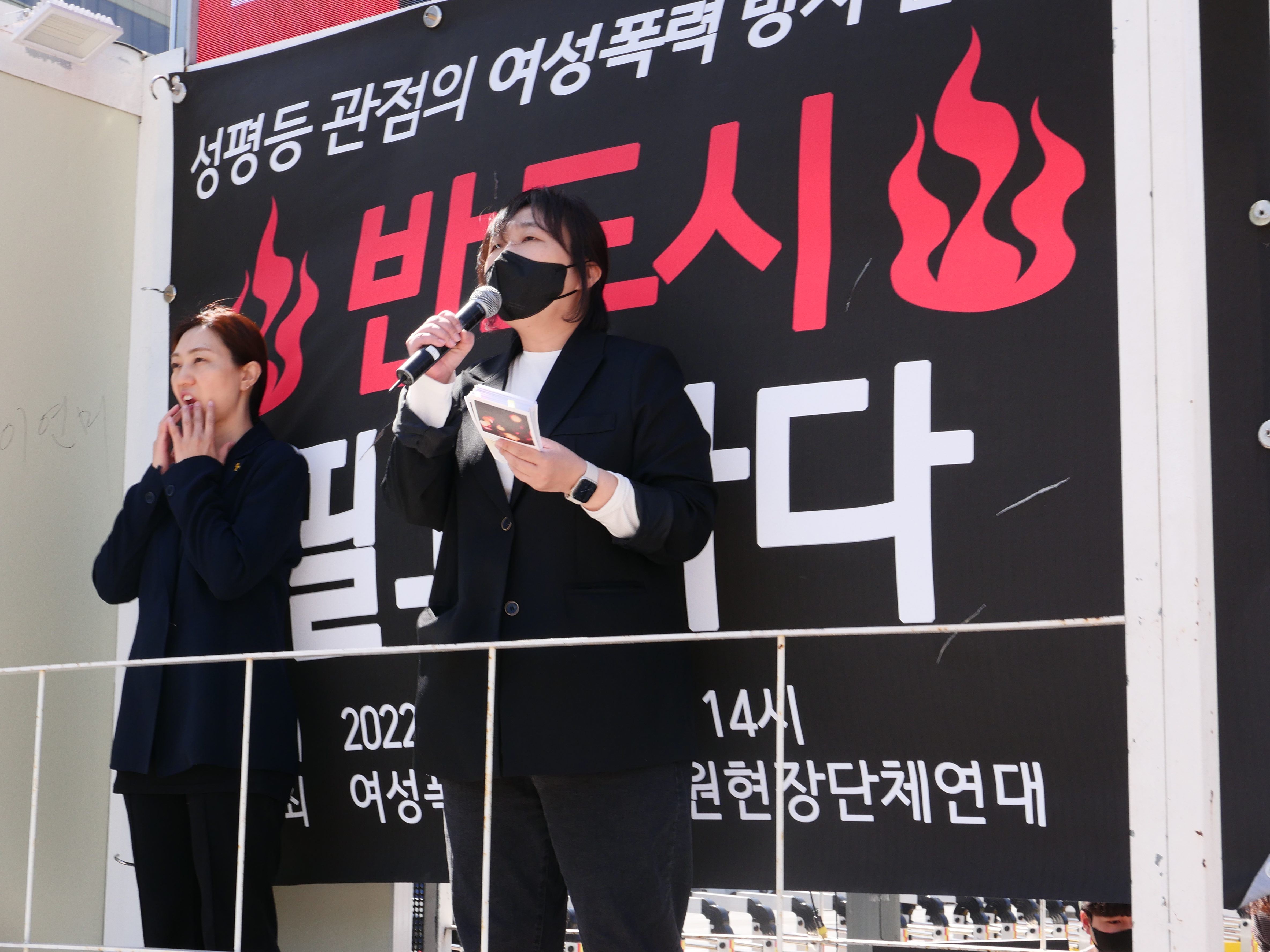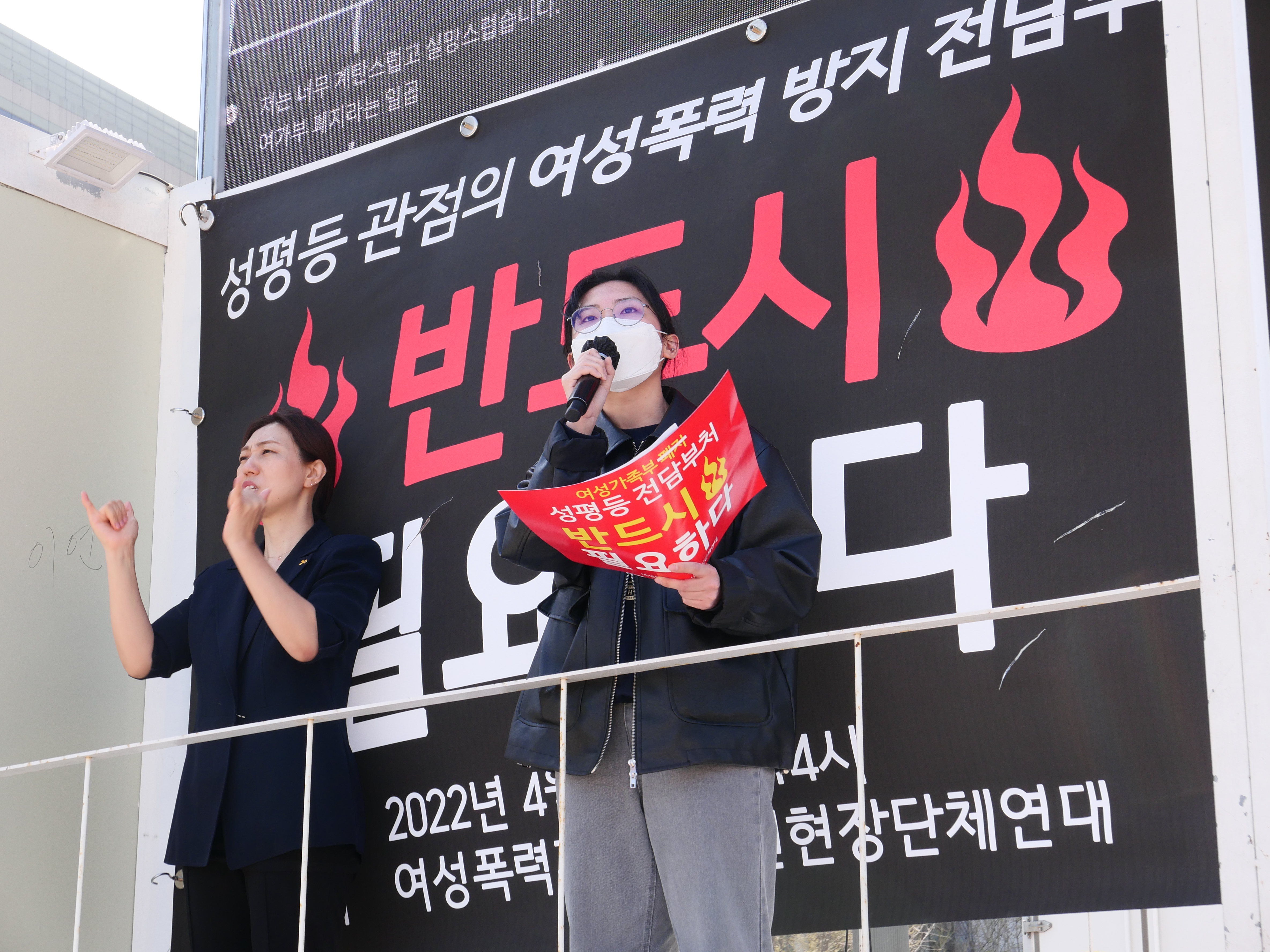 여성의전화에서도 전주여성의전화의 민경아 활동가, 한국여성의전화의 도경은 활동가가 발언자로 나서 성평등 전담부처의 필요성과 여성폭력피해자 지원 공백 대책 촉구, 친밀한 관계 내 여성폭력의 심각성과 데이트폭력/스토킹 피해의 현실에 대해 발언하였습니다.