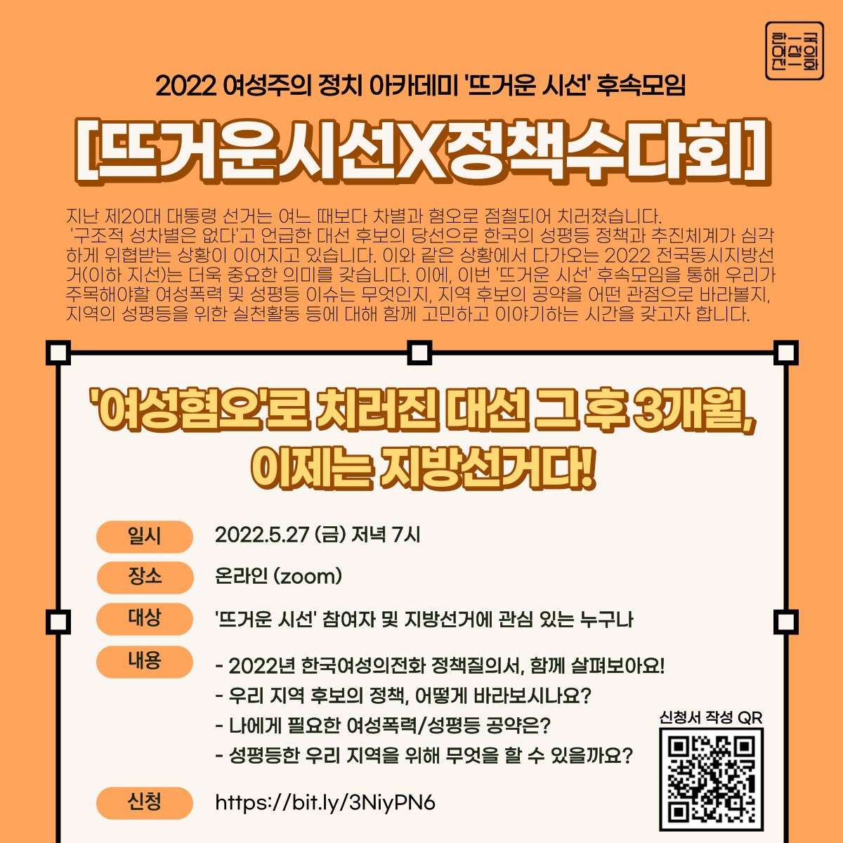 | [교육] 2022 여성주의 정치 아카데미 ‘뜨거운 시선’ <지방선거가 남았다 - 성평등 정치를 위한 지방선거 대응 전략 세우기> (0) | 2022.05.07 |