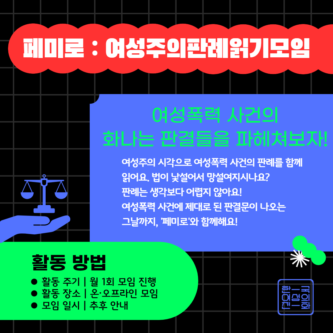 여성주의 시각으로 여성폭력 사건의 판례를 함께 읽어요. 법이 낯설어서 망설여지시나요? 판례는 생각보다 어렵지 않아요!