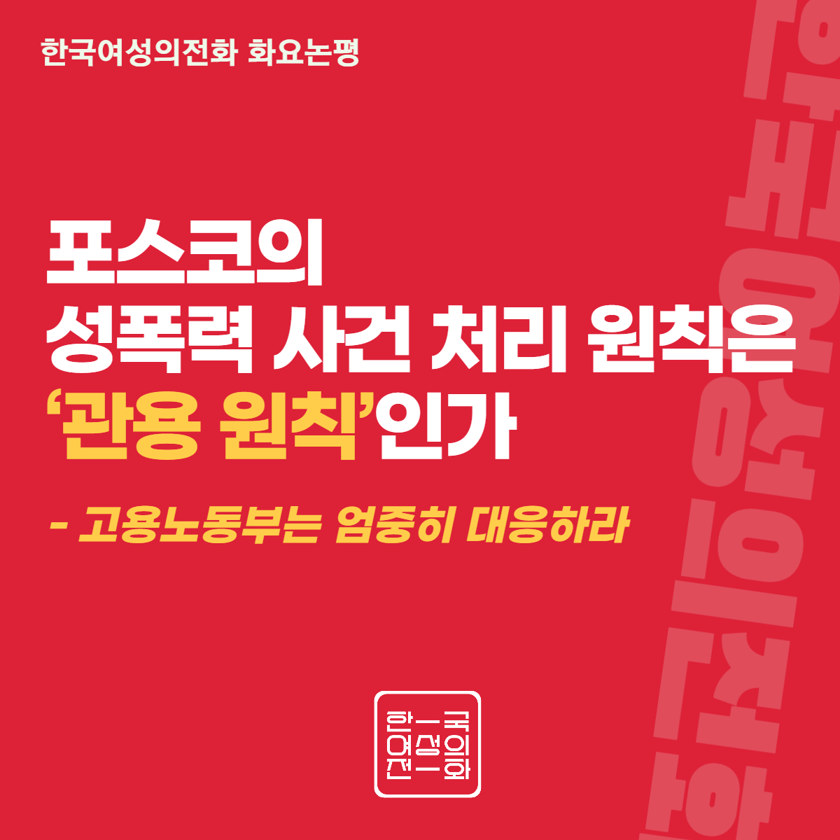 포스코는 본 사건에 ‘원 스트라이크 아웃 제도를 적용한 것’이라고 밝혔다. 만연한 성폭력에도 감봉에 그친 징계를 내린 것이 어떻게 ‘무관용’ 원칙을 적용했다고 할 수 있는가. 바로 그 알 수 없는 원칙이 사내 ‘강간 문화’를 키우고 용인한 것임을 왜 모르는가. 사법기관과 고용노동부는 자정 능력이 없는 포스코를 엄중히 조사하여, 제대로 된 피해 회복과 피해자의 인권 보장을 위한 조치를 취하라.