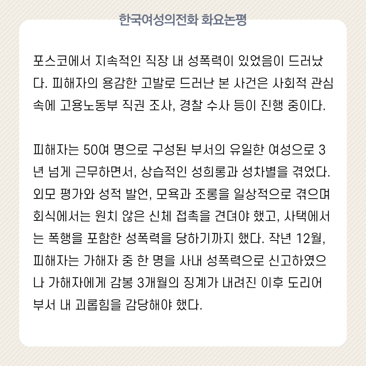 피해자는 50여 명으로 구성된 부서의 유일한 여성으로 3년 넘게 근무하면서, 상습적인 성희롱과 성차별을 겪었다. 외모 평가와 성적 발언, 모욕과 조롱을 일상적으로 겪으며 회식에서는 원치 않은 신체 접촉을 견뎌야 했고, 사택에서는 폭행을 포함한 성폭력을 당하기까지 했다. 작년 12월, 피해자는 가해자 중 한 명을 사내 성폭력으로 신고하였으나 가해자에게 감봉 3개월의 징계가 내려진 이후 도리어 부서 내 괴롭힘을 감당해야 했다. 심지어 포스코는 사건이 불거진 후에야 부회장 명의의 사과문을 냈지만, 뒤로는 피해자를 찾아가 ‘무엇을 원하느냐’고 괴롭히기도 했다. 현재 피해자는 가해자 중 4명을 그간 사건을 제대로 처리하지 못했던 회사가 아닌, 경찰에 고소한 상태다.