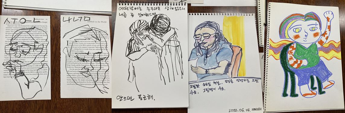 그림을 통해 사람들의 마음을 만나는 과정은 매번 신비롭다고 느낀다. 우리의 첫 번째 만남은 ‘내가 그리고 싶은 여성’이라는 주제로 각자 자신만의 순서와 방식으로 나타내보았다. 나는 생각하며 그리는 것을 좋아하는 편이라서 시간이 부족할 수도 있어 미리 스케치를 어느 정도 잡아놓고 시작하였다. 그러나 어떤 분은 손이 가는 대로 그리면서 그림 작업 중인 회원들의 모습들을 그려 선물해주시기도 하였다.