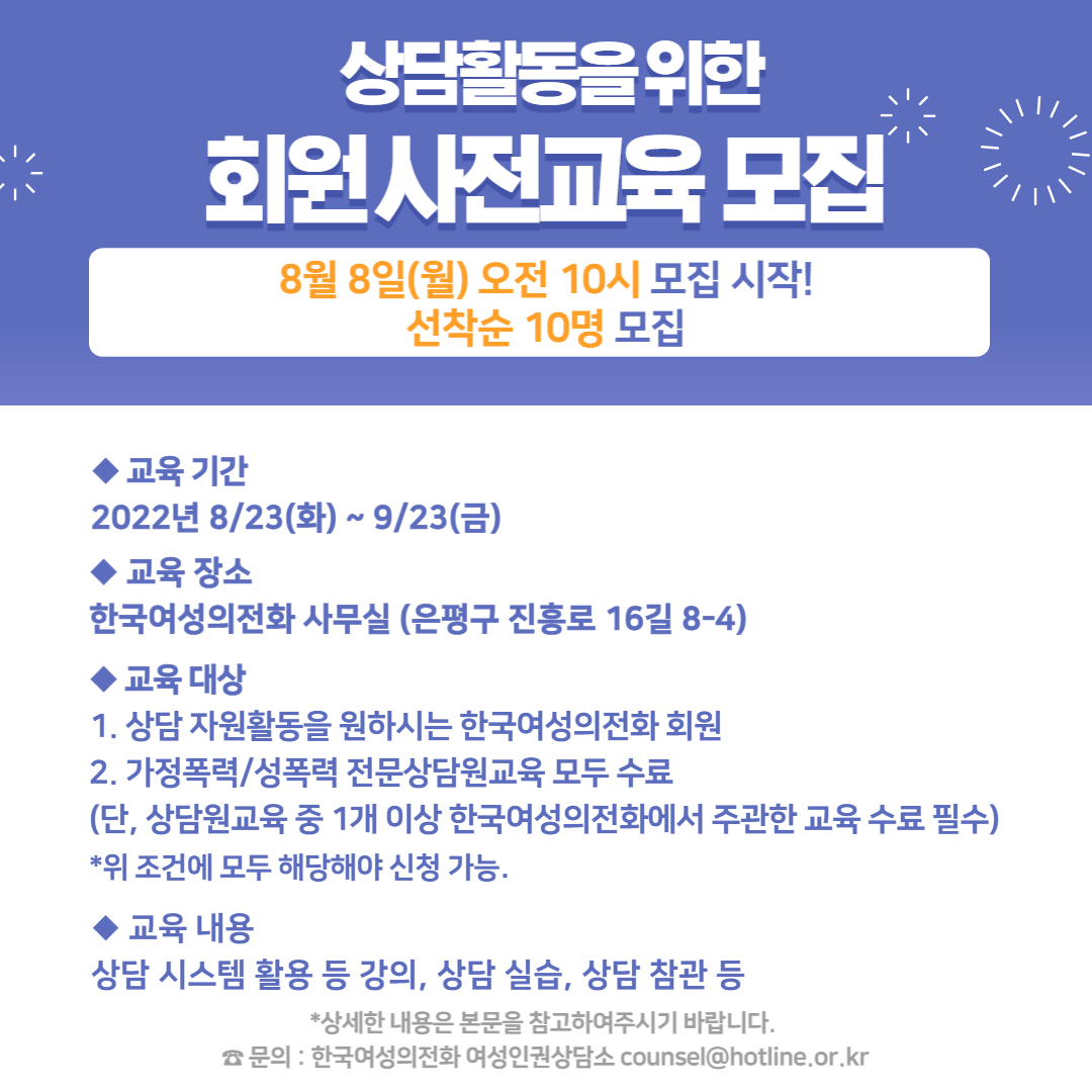 한국여성의전화 상담자원활동을 원하시는 회원분들을 위해 상담활동회원 사전교육과정을 실시하오니, 여성폭력문제와 여성운동에 관심을 갖고 계신 회원 분들의 많은 참여 바랍니다.