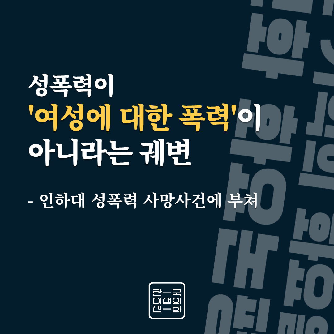 7월 15일, 인하대학교 교내에서 한 학생이 추락한 채 발견되어 끝내 숨졌다. 유력한 용의자로 검거된 이는 다름 아닌 같은 학교 동급생이었다. 그는 피해자를 성폭행한 혐의를 인정하였고, 살인 혐의에 대해 조사받고 있다. 이번 사건은 여성에게 안전하고 자유로운 공간은 존재하지 않는다는 점과 함께, 여성폭력 문제가 우리 사회에 얼마나 시급한 과제인지를 다시금 드러냈다. 그러나 누리꾼과 언론을 비롯하여 제대로 된 반성과 대책을 내놓아야 할 대학과 정부까지 사건의 본질을 파악하고 대처하려는 노력보다 여성폭력에 대한 몰이해와 잘못된 통념을 기반으로 성폭력 사건을 ‘피해자의 탓’ ‘개인적 문제’ 등으로 축소·왜곡하고 있다.