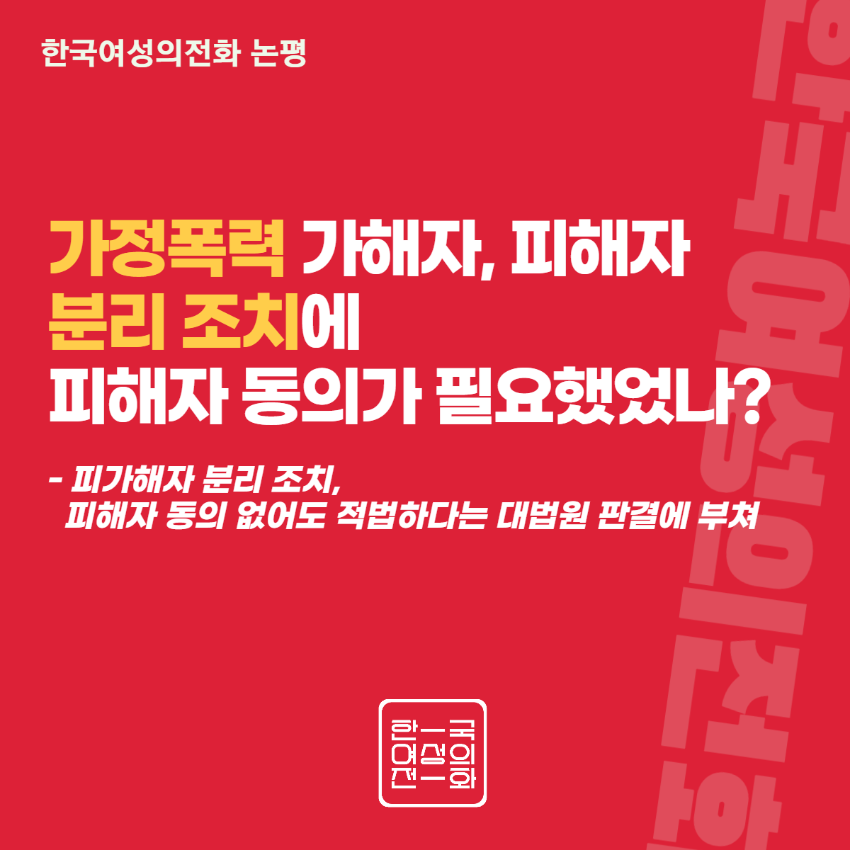 지난 8월 11일, ‘피해자의 동의’가 없어도 가정폭력 가해자와 피해자를 분리하는 조치가 적법하다는 대법원의 첫 판결이 나왔다. 대법원은 해당 판결에서 “가정폭력처벌법의 입법목적과 응급조치의 취지, 가정폭력범죄의 특수성 등을 고려하면 가정폭력 가해자와 피해자의 분리조치에 피해자의 동의가 필요하지 않다”고 판시하였다. 이미 우리 법률은 가정폭력범죄 신고를 받은 경찰이 즉시 현장에 나가서 폭력행위를 제지하고, 가해자와 피해자를 분리하도록 하고 있다. 여기 어디에도 피해자의 ‘동의’ 여부를 확인하도록 되어 있지 않다. 그럼에도 불구하고 ‘피해자가 처벌을 원치 않는다’는 말은 가정폭력범죄 가해자를 분리하지도, 수사하지도, 처벌하지도 못하는 주요 사유로 자주 언급되어왔다.