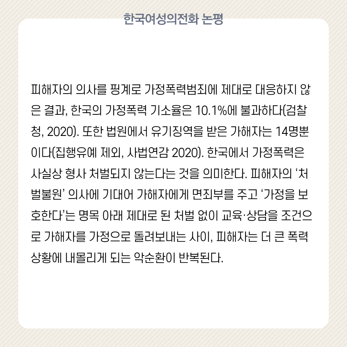피해자의 의사를 핑계로 가정폭력범죄에 제대로 대응하지 않은 결과, 한국의 가정폭력 기소율은 10.1%에 불과하다(검찰청, 2020). 또한 법원에서 유기징역을 받은 가해자는 14명뿐이다(집행유예 제외, 사법연감 2020). 한국에서 가정폭력은 사실상 형사 처벌되지 않는다는 것을 의미한다. 피해자의 ‘처벌불원’ 의사에 기대어 가해자에게 면죄부를 주고 ‘가정을 보호한다’는 명목 아래 제대로 된 처벌 없이 교육·상담을 조건으로 가해자를 가정으로 돌려보내는 사이, 피해자는 더 큰 폭력 상황에 내몰리게 되는 악순환이 반복된다.