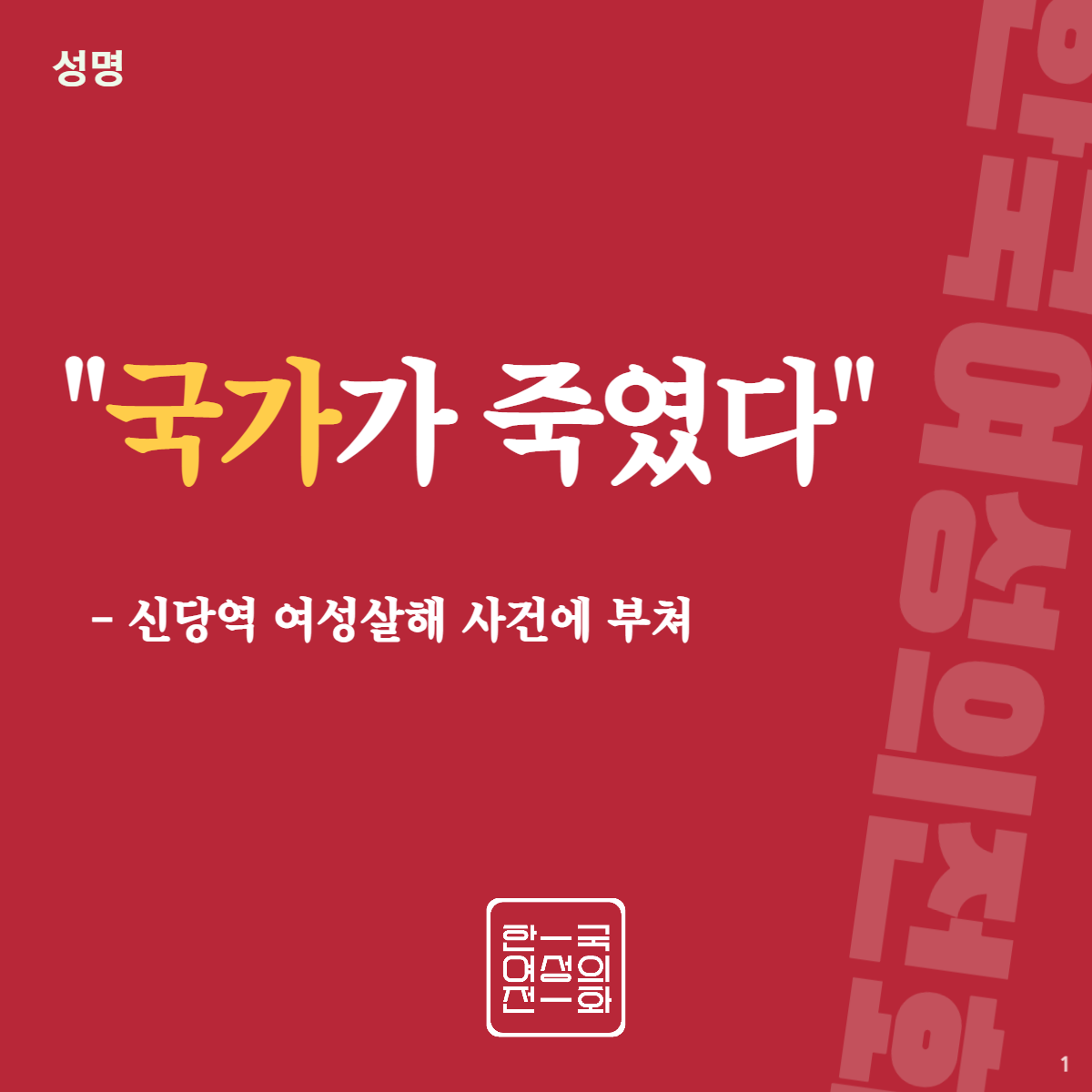 9월 14일, 지하철 신당역 내부 화장실에서 또 한 명의 여성이 살해당했다. 언론보도에 따르면 피해자는 3년간 불법촬영, 협박, 스토킹 피해를 당했으며, 두 차례 고소를 통해 국가의 개입과 보호를 요청하였다. 그러나 국가는 또다시 피해자의 생명을 지키는 것조차 실패했다. 사건을 접한 누리꾼은 “나라가 죽였다”는 의견을 전하기도 하였고, 신당역에 꾸려진 추모 장소를 찾은 시민들은 자신이 겪은 스토킹·성폭력 피해 경험을 언급하고 ‘여성을 위한 나라는 없다’는 메시지를 포스트잇에 써 붙이며 국가는 도대체 무엇을 하고 있었는지 질책했다.