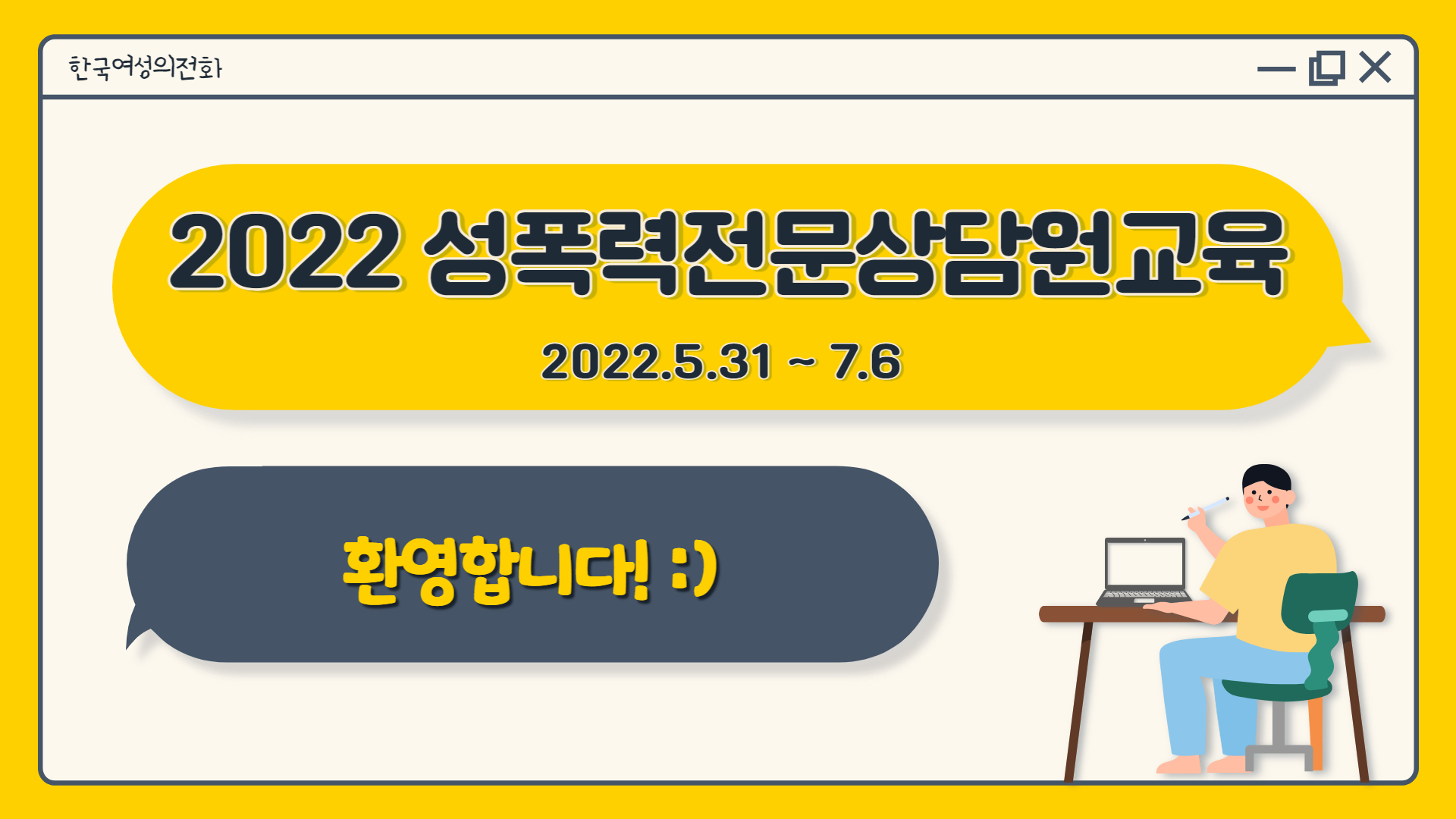 그렇게 마음속으로만 불편함을 느끼고 있다가, 평소 구독하던 한국여성의전화 SNS에서 성폭력전문상담원교육 참여자를 모집한다는 게시글을 보게 되었습니다. 커리큘럼을 살펴보니 꼭 상담원 취업이 목적이 아니더라도, 제가 맞닥뜨리고 있는 상황에 대처하는 방법을 비롯해 여성 인권에 대한 다양한 내용을 배울 수 있을 것 같았습니다. 신청해볼까? 생각했지만, 평일 100시간이라는 현실적 제약에 주저하게 되었습니다. 하지만 그냥 다니던 회사나 잘 다니자 싶다가도, 자꾸 교육을 듣고 싶단 마음이 들었습니다. 직장은 다시 들어갈 수 있지만, 이 교육은 지금 아니면 못 들을 수 있겠단 생각도 했고, 여성 차별적, 여성 혐오적 조직문화에 익숙해진 제가 이 교육을 통해 변화할 수 있지 않을까 하는 생각도 했습니다. 결국, 저는 성폭력 상담원 교육을 듣기 위해 퇴사라는 선택을 했습니다. 당시엔 ‘교육의 내용이 내가 기대했던 것과 다르면 어떡하지?’라는 걱정은 하지 않았습니다. 저에겐 교육을 신청하는 것 자체가 제 인권을 위한 자그마한 운동이었고, 큰 도전이었으니까요.