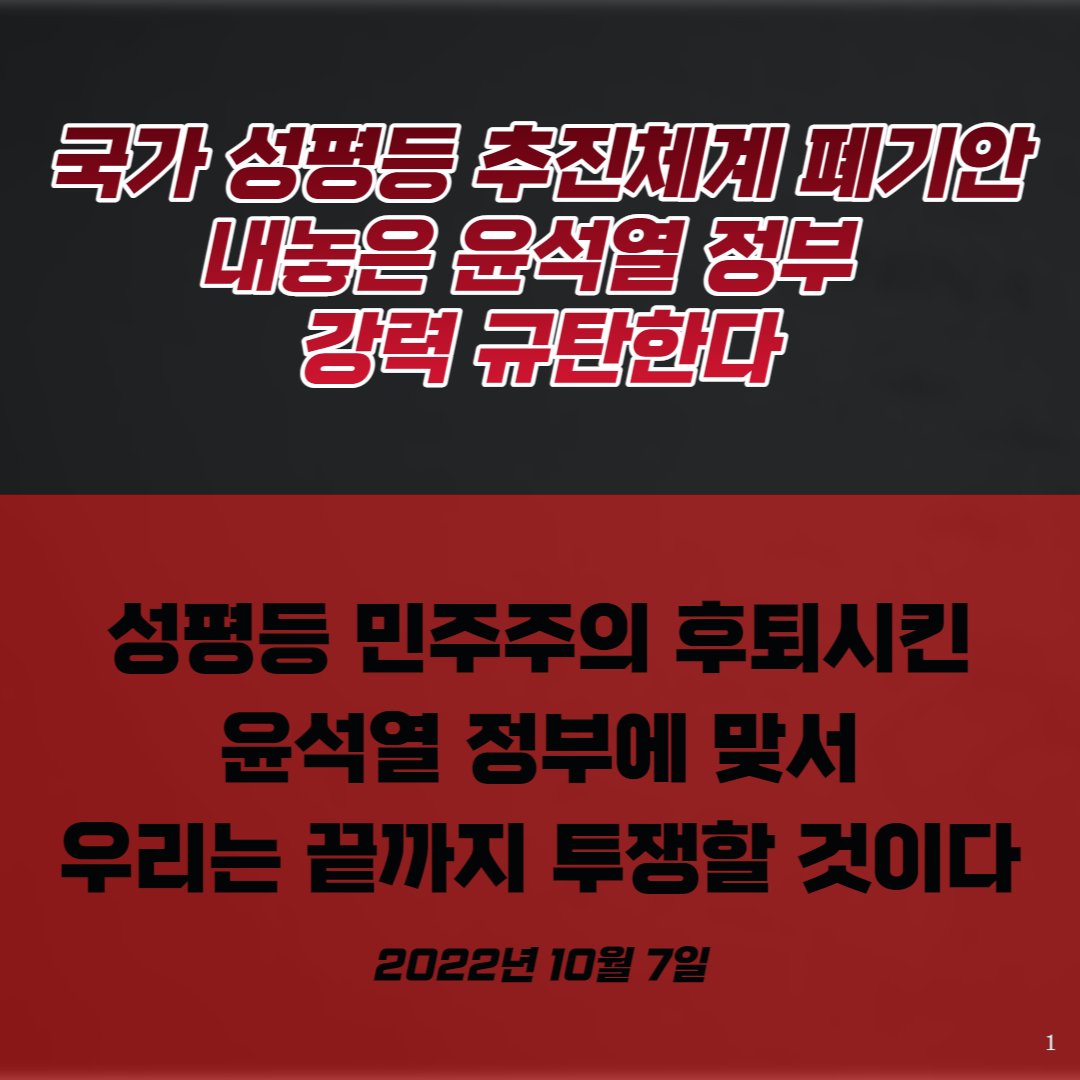 2001년 여성부가 출범하고 20년의 세월이 흘렀다. 그러나 여전히 한국은 세계성격차지수 99위로 여성의원 비율은 100위권 밖이며, 고위직·관리자 비율의 성별 격차는 125위, 소득 격차는 120위로 조사대상국 가운데 최하위권을 기록하고 있다. 여성에 대한 강력범죄는 줄지 않고 있으며, 여성들은 매일 안전을 위협받고 있다. 그럼에도 불구하고 국가의 역할은 잊고 '여성 지우기'에 몰두하며 정쟁의 도구로 삼고 있는 정부는 더 이상 국민을 우롱하지 말라. 성평등한 사회를 열망하는 수많은 시민들의 목소리를 외면하는 여성가족부 폐지안을 당장 폐기하라. 실질적 양성평등사회를 위해 여성가족부를 폐지한다는 윤석열 정부는 국민을 기망하지 말라. 성평등 민주주의 후퇴시킨 윤석열 정부 각오하라. 우리는 결사항전의 태도로 투쟁할 것이다.